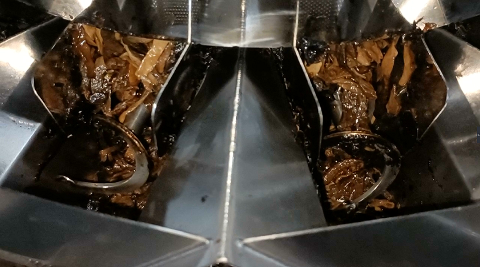 该系统配备的是广东精威新型14头双螺杆酱菜组合秤,采用IP65防水机箱,接触物料部件为食品级304小花纹不锈钢板材,同时下料斜槽设计60°大倾角,保证卫生安全,物料运转畅顺高效。